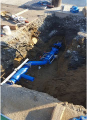 配水管布設工事は、私たちが日々使用する水を各家庭や施設に届けるため『配水管』を道路や能動の地中に埋めパイプを布設する工事です。