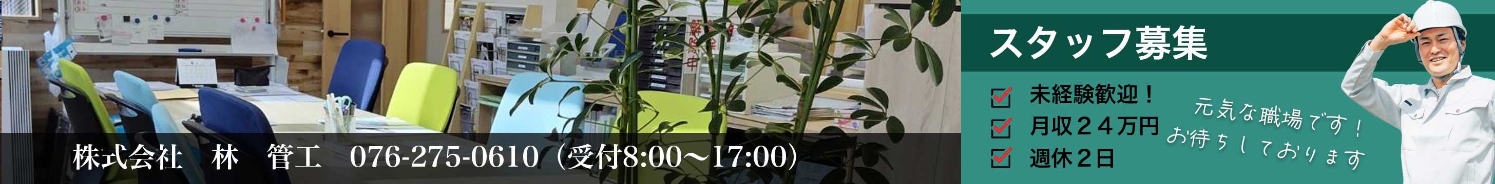 | 必要な免許・資格 | 普通自動車免許*AT限定不可 管工事布設管理技士1級または、2級有資格者は優遇します。など |